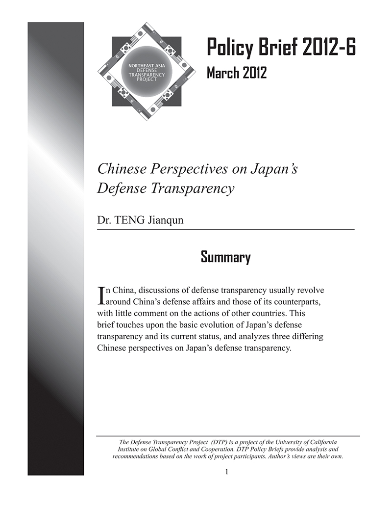 In China, discussions of defense transparency usually revolve around China’s defense affairs and those of its counterparts, with little comment on the actions of other countries. This brief touches upon the basic evolution of Japan’s defense transparency and its current status, and analyzes three differing Chinese perspectives on Japan’s defense transparency.